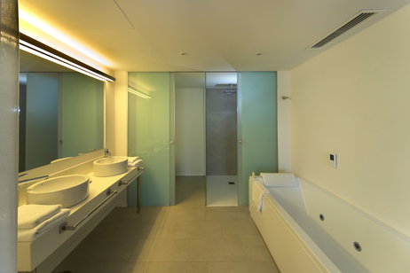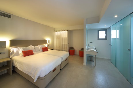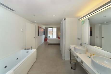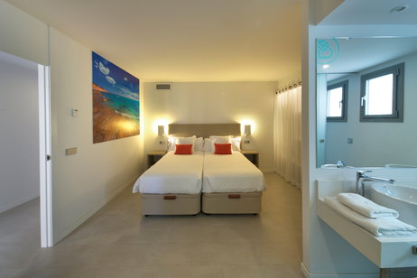 De 80 m2, el Apartamento Superior dispone de dos dormitorios, uno de ellos con una cama doble (matrimonio) bañera hidromasaje y el otro con dos camas individuales y un sofá cama en el salón.